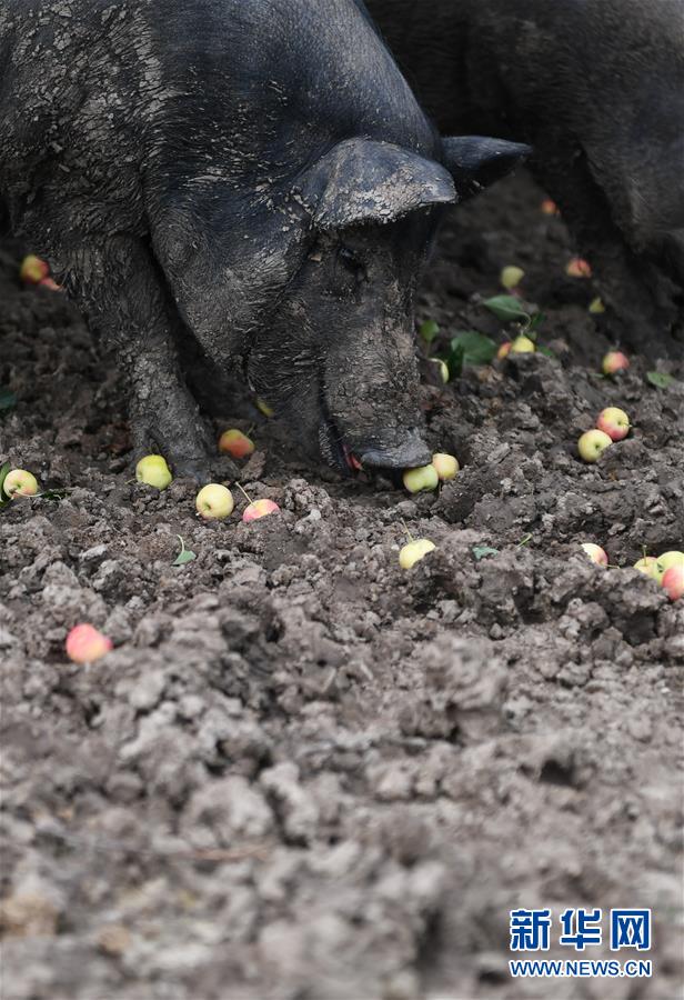 8月20日,康丹丹在接受采訪時(shí),一頭水果香豬來(lái)?yè)屖乘@子里的海棠果。新華社記者 王昊飛 攝
