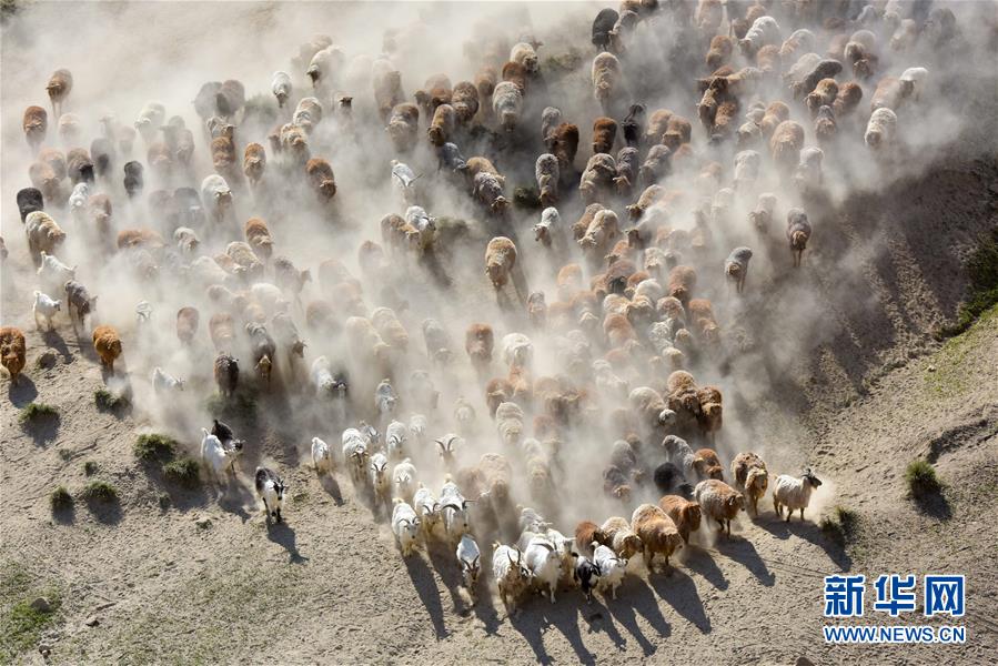 6月6日,轉(zhuǎn)場的牲畜行走在牧道上。新華社記者 丁磊 攝