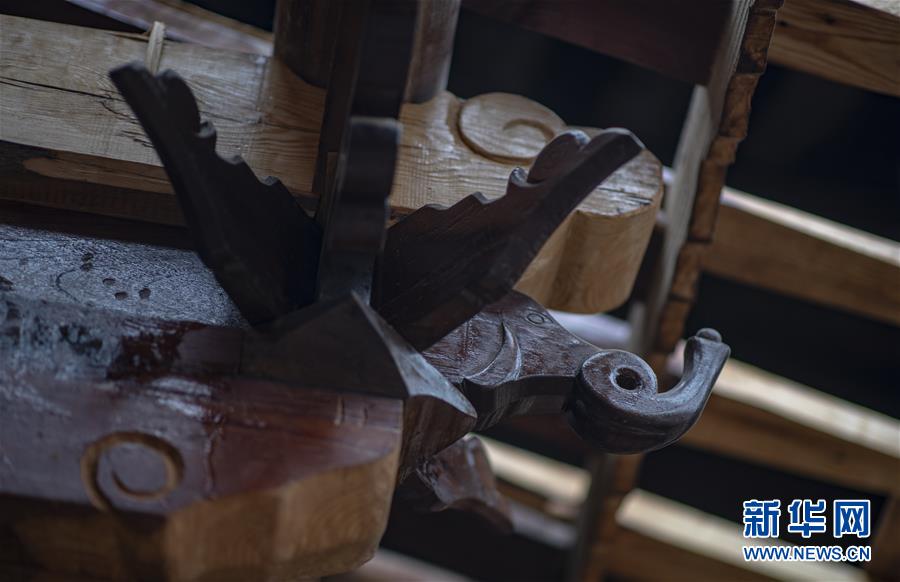 石屏縣異龍鎮(zhèn)符家營(yíng)村211號(hào)民居中修繕完成的木斗拱(8月8日攝)。新華社記者 江文耀 攝