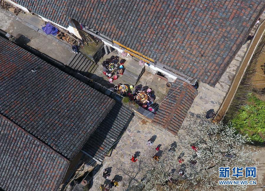 游客在龍革雄家的院子里吃午飯 (3月3日無(wú)人機(jī)拍攝)。 新華社記者 黃孝邦 攝