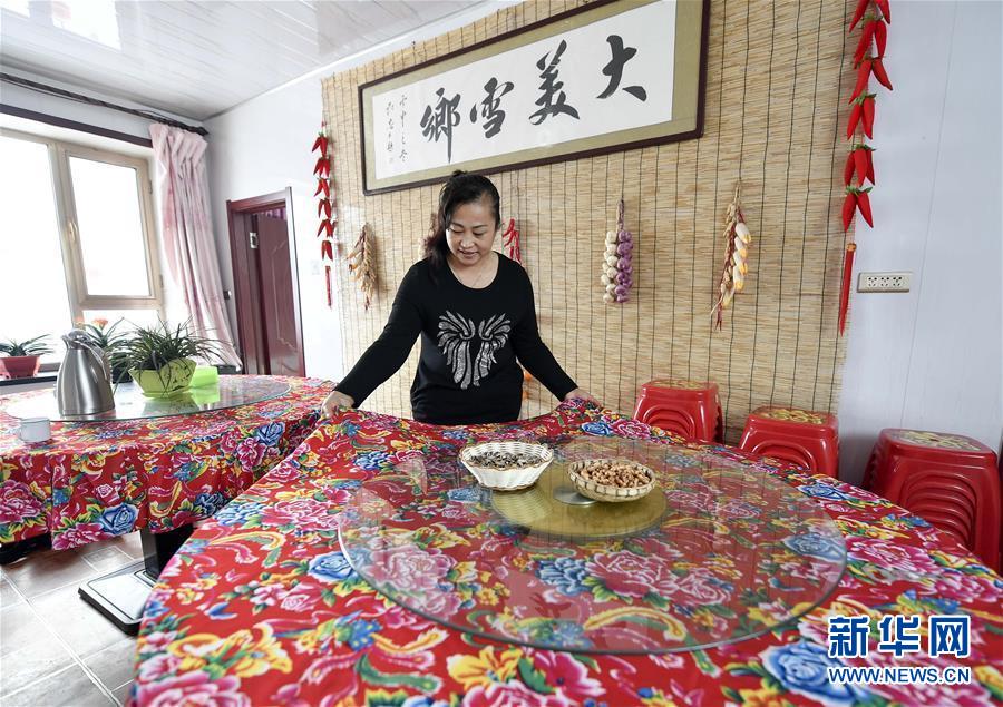 在舒蘭市二合屯,何翠華在自家農家樂內整理桌布(1月25日攝)。二合雪鄉(xiāng)的發(fā)展讓二合屯村民何翠華將“農閑”變?yōu)椤稗r忙”,一個雪季能夠收入近4萬元。 新華社記者許暢攝