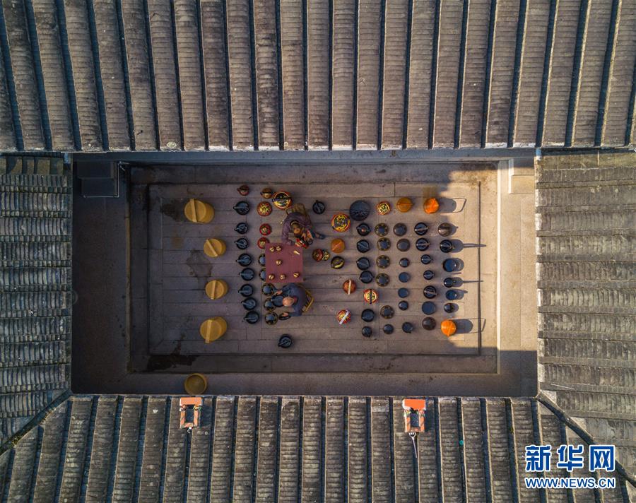 在福建省永春縣仙夾鎮(zhèn)龍水村,村民在老宅制作當地特色漆籃(1月28日無人機拍攝)。 新華社記者 宋為偉 攝