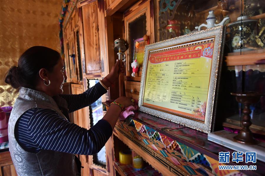 在青海省玉樹藏族自治州治多縣治渠鄉(xiāng)同卡村,村民昂文西讓的妻子布沙措江卓瑪清理家里的柜子(9月12日攝)。新華社記者 孫瑞博 攝
