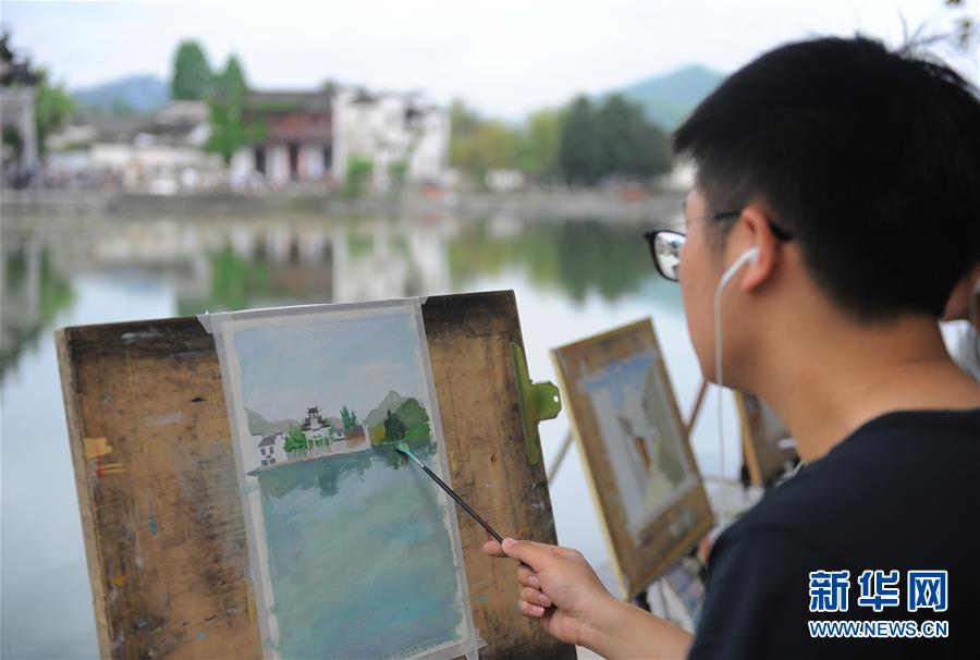4月24日,繪畫愛好者在西遞風(fēng)景區(qū)寫生。新華社記者任鵬飛攝