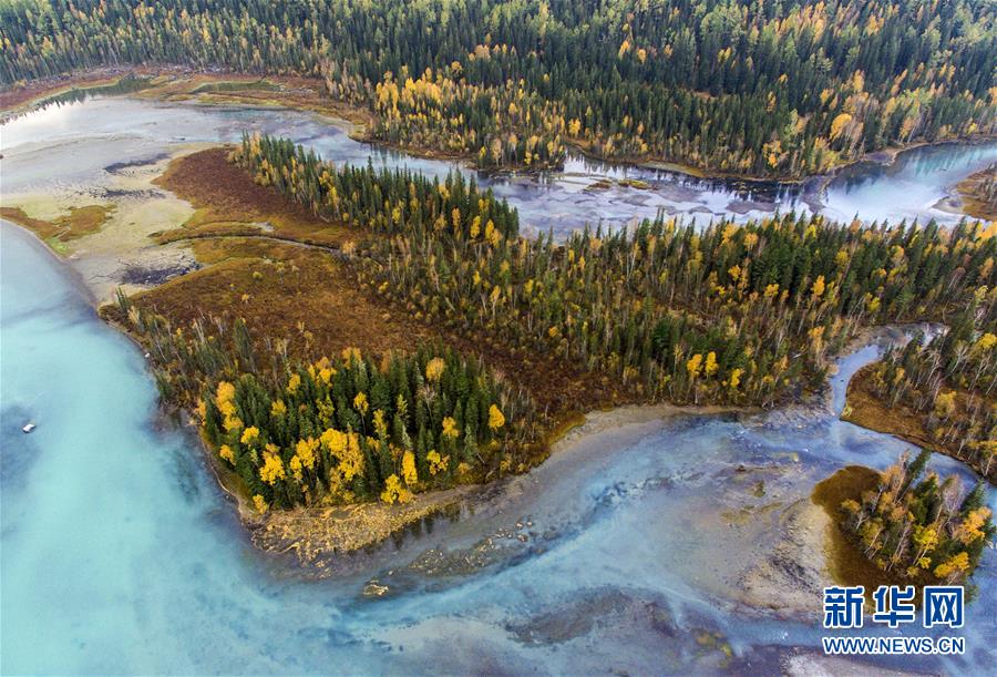 9月24日無人機(jī)拍攝的喀納斯景區(qū)風(fēng)光。新華社記者 王菲 攝