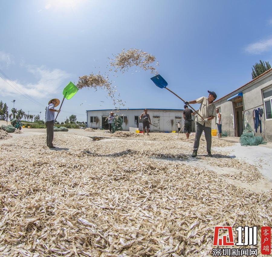 渤海灣畔海產(chǎn)豐收,成群魚蝦分揀后當(dāng)街晾曬,場面賽曬糧食