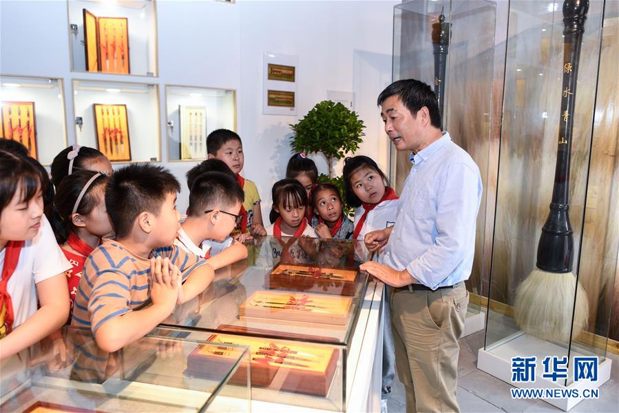 10月14日,小學生在非遺活態(tài)傳承館觀看湖筆的實物展示。新華社記者 黃宗治 攝