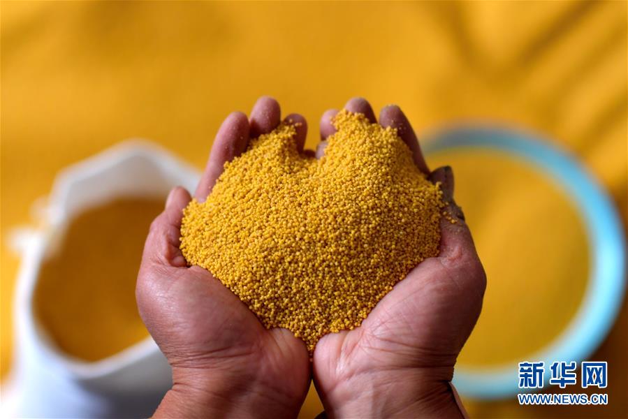 在奪火鄉(xiāng)高谷堆村,村民在打包加工好的小米(10月14日攝)。
