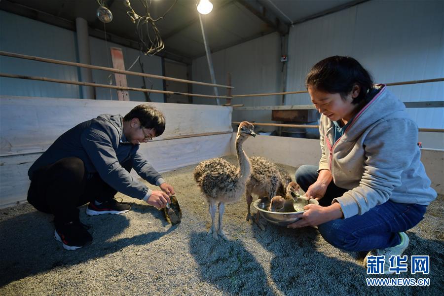村民許俊鵬和妻子在照料小鴕鳥(10月14日攝)。2017年初,高谷堆村貧困戶許俊鵬一家在扶貧干部的幫助下開始嘗試養(yǎng)殖鴕鳥創(chuàng)收。目前,許俊鵬一家已建成擁有20余只鴕鳥的養(yǎng)殖基地,平均年收入近4萬元。  新華社記者 曹陽 攝