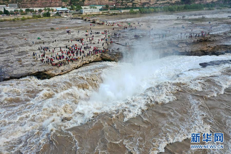 受近日降雨影響,位于山西吉縣的壺口瀑布水量增大,壯美的瀑布群景觀吸引眾多游客前來觀賞。新華社記者楊晨光攝