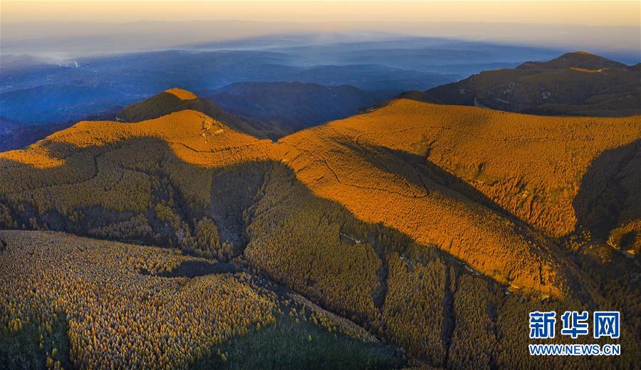 日出時分的好地方林場秋色(10月10日無人機拍攝)。新華社記者陶明攝