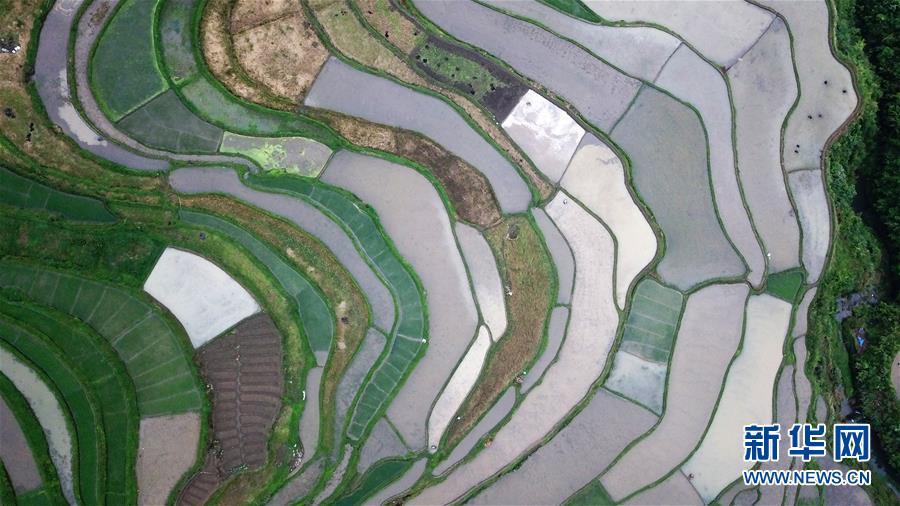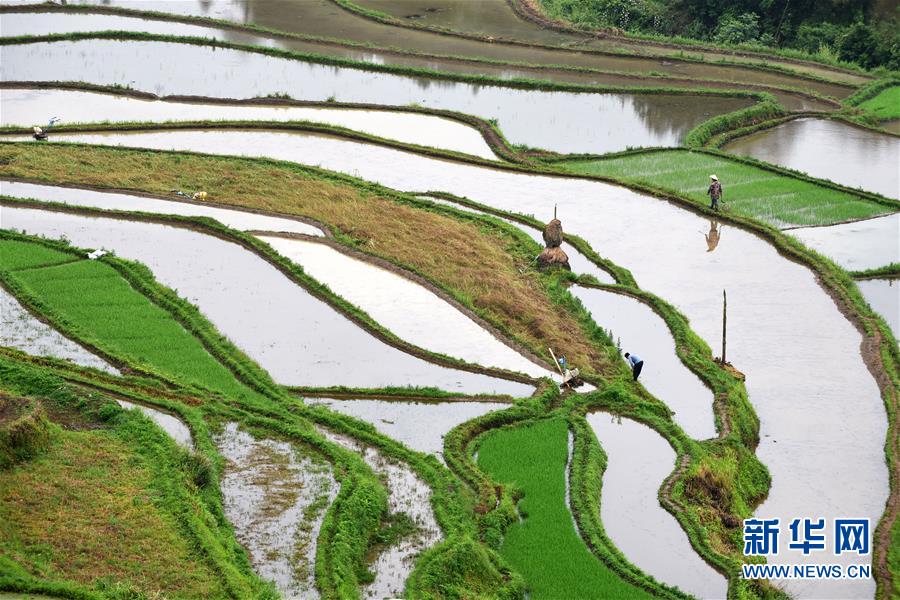 5月18日,農(nóng)民在貴州省丹寨縣龍泉鎮(zhèn)高要梯田里耕作(無人機拍攝)。初夏時節(jié),位于貴州省丹寨縣龍泉鎮(zhèn)的高要梯田景色優(yōu)美。新華社記者楊文斌攝