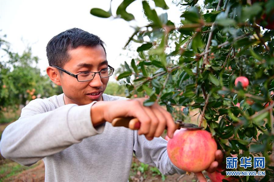 在河南省南陽市淅川縣九重鎮(zhèn)張河村,農(nóng)民在軟籽石榴基地采摘石榴(10月19日攝)。新華社記者馮大鵬攝