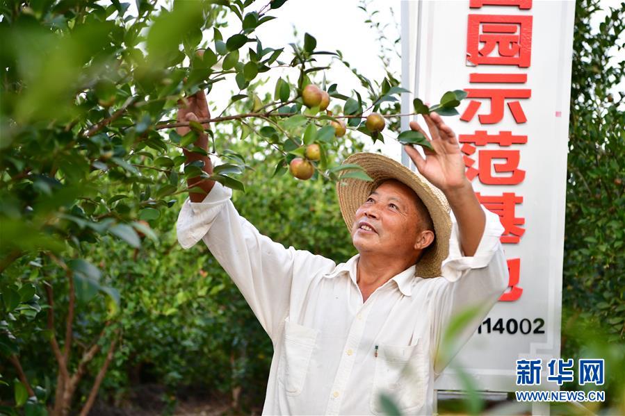 在河南省信陽(yáng)市光山縣槐店鄉(xiāng),農(nóng)民在聯(lián)興油茶基地查看油茶果生長(zhǎng)狀況(9月4日攝)。新華社記者馮大鵬攝