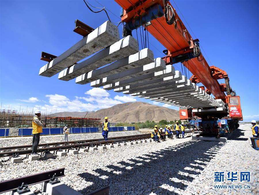 6月6日,負(fù)責(zé)鋪軌的中鐵十一局集團(tuán)的建設(shè)者在現(xiàn)場(chǎng)作業(yè)。新華社記者覺(jué)果攝