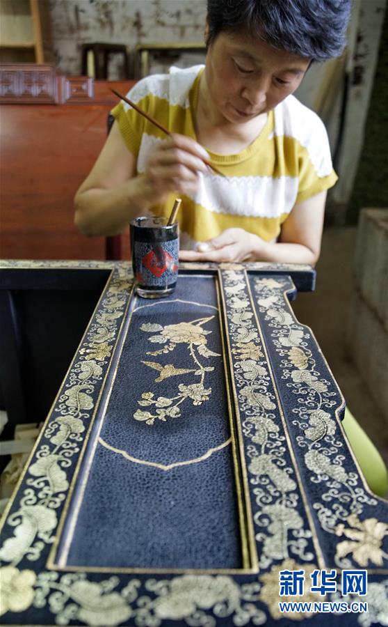 北京金漆鑲嵌有限責(zé)任公司的技師運用貼金描漆的技藝制作屏風(fēng)(10月31日攝)。新華社記者李欣攝