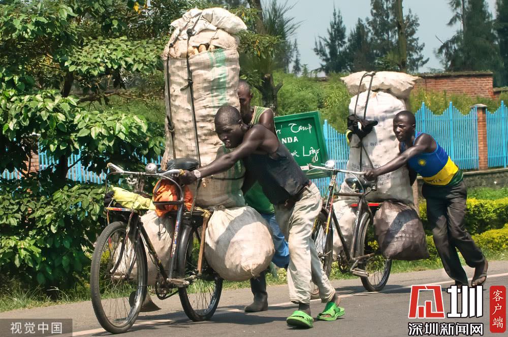 盧旺達(dá),剛果和鄰國盧旺達(dá)的工人們每次要走20英里(約32公里)來運(yùn)輸他們的貨物。從小村莊、農(nóng)場到城鎮(zhèn)里的市場,很多不同的貨物,如床墊和卷心菜都被小心地固定在了自行車上,它們要被掛著走很遠(yuǎn)的路,之后到市場上被賣掉。一張圖拍攝的是一個(gè)人騎著一輛自行車,車后面載了7種不同顏色的床墊。很多自行車上都綁著裝大土豆的麻袋,這些麻袋重達(dá)30英石(約18千克),工人們將會(huì)把它們運(yùn)到市場上賣掉。