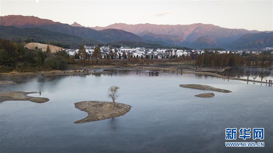 這是11月14日無人機(jī)拍攝的安徽黟縣奇墅湖晨景。新華社記者韓曉雨攝