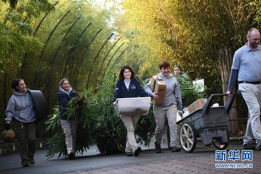 11月19日,在美國華盛頓的美國國家動物園,飼養(yǎng)員運(yùn)送竹子、水果、飲用水等,供“貝貝”飛行期間食用。 新華社記者 劉杰 攝