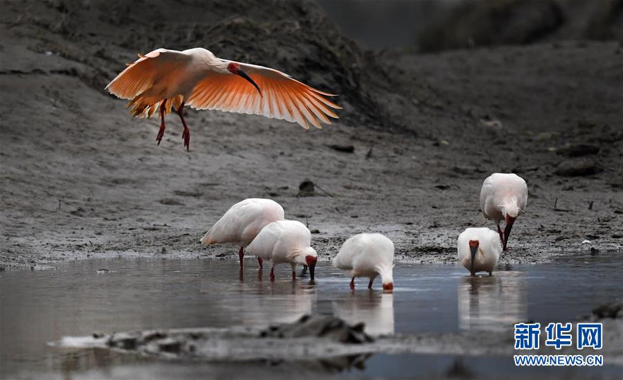 11月19日,朱鹮在漢江支流的牧馬河畔覓食。 新華社記者陶明攝