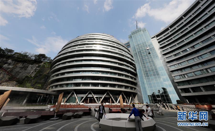 一條人造瀑布從酒店主體建筑旁的礦坑頂部流下(11月13日攝)。新華社記者方喆攝