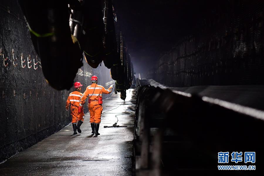 11月26日,在上灣煤礦12402綜采面內(nèi),工作人員沿著輸送帶進行巡視。 新華社記者 邵瑞 攝