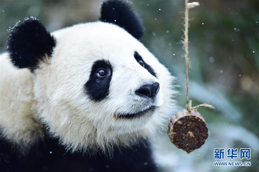 11月29日,在西寧熊貓館內,一只大熊貓在吃飼養(yǎng)員投送的食物。 新華社記者 吳剛 攝