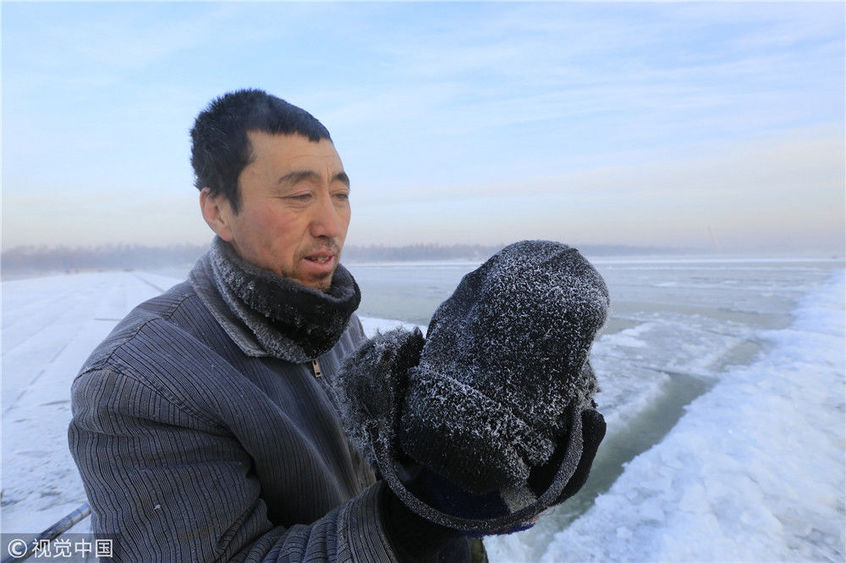 2018年12月11日,黑龍江省哈爾濱市,松花江上,采冰者們彎腰拉繩,宛如纖夫般拽重達半噸的冰塊出水。采冰者都是自哈市江北萬寶、東發(fā)、沙陀子等鄉(xiāng)鎮(zhèn)的農(nóng)民,他們每年冬閑時都會親屬、村鄰之間結(jié)伴到松花江畔采冰,有的采冰人,已經(jīng)連續(xù)干了二十多年。每個采冰季,他們每天要在冰面上工作10-12個小時,每個采冰組,一天要拽出冰塊2000-3000塊,一個近20天的采冰季,每人能收入近萬元。