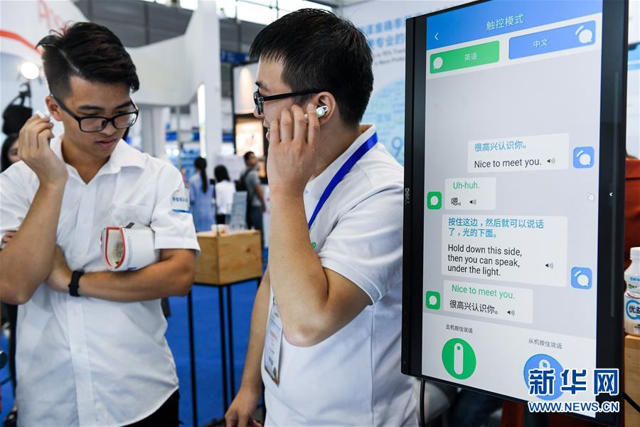 2018年11月16日,在深圳舉行的第20屆高交會(huì)上,來自深圳的年輕創(chuàng)客(右)向參觀者介紹團(tuán)隊(duì)研發(fā)的同聲傳譯耳機(jī)。 新華社記者 毛思倩 攝