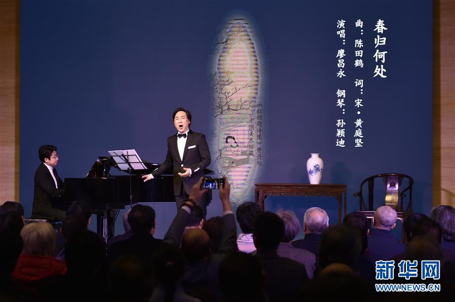 12月10日晚,廖昌永在音樂(lè)會(huì)上演唱《春歸何處》。 當(dāng)晚,中國(guó)古典詩(shī)詞與書(shū)畫(huà)——廖昌永中國(guó)藝術(shù)歌曲獨(dú)唱音樂(lè)會(huì)在北京中國(guó)美術(shù)館舉行。 新華社記者 魯鵬 攝