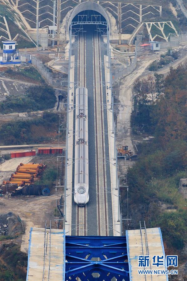12月2日,一輛試驗(yàn)列車駛過成貴高鐵鴨池河特大橋。新華社記者劉續(xù)攝