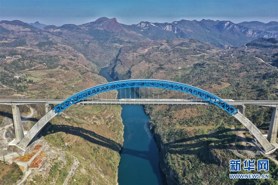 12月16日,一列動(dòng)車組列車從成貴高鐵鴨池河特大橋上駛過(無(wú)人機(jī)拍攝)。新華社記者歐東衢攝