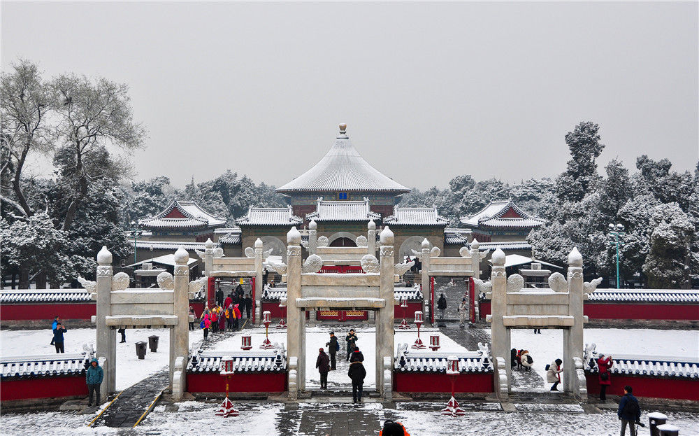 2019年11月30日,北京,初雪過(guò)后,天壇公園銀裝素裹,白雪古建相互映襯,景色迷人。時(shí)永平/千龍圖像/視覺中國(guó)