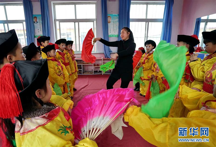 12月19日,河北省灤州市小閆營小學(xué)教師在為學(xué)生示范地秧歌動作要領(lǐng)。新華社記者 牟宇 攝