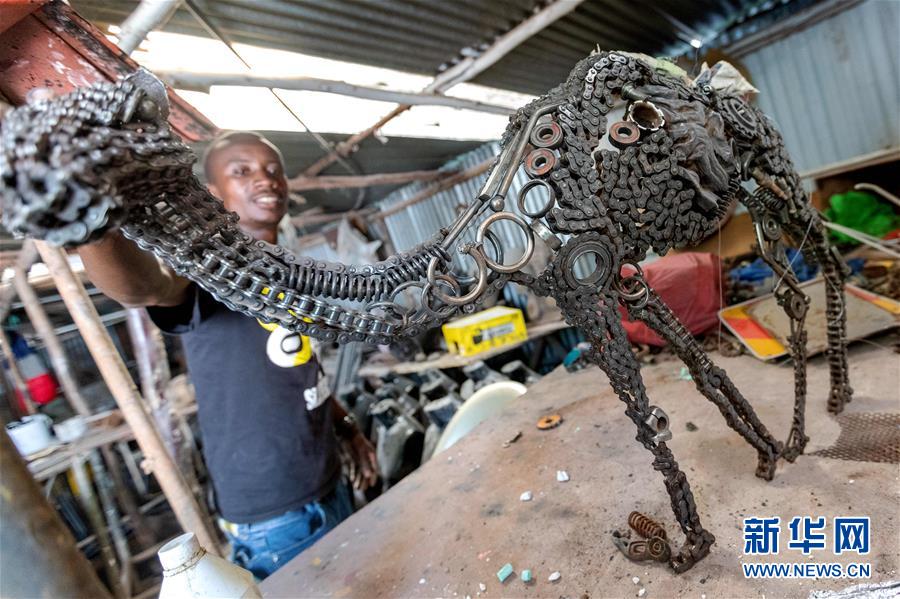 12月20日,在肯尼亞內(nèi)羅畢庫(kù)奧納藝術(shù)中心,一名藝術(shù)家展示裝置藝術(shù)作品。成立于1995年的庫(kù)奧納藝術(shù)中心位于肯尼亞首都內(nèi)羅畢市區(qū),目前有17間雕塑、繪畫(huà)等藝術(shù)工作室。中心不定期舉辦藝術(shù)展覽活動(dòng),園區(qū)內(nèi)陳列有各類涂鴉墻及裝置藝術(shù)作品。 新華社記者 王騰 攝