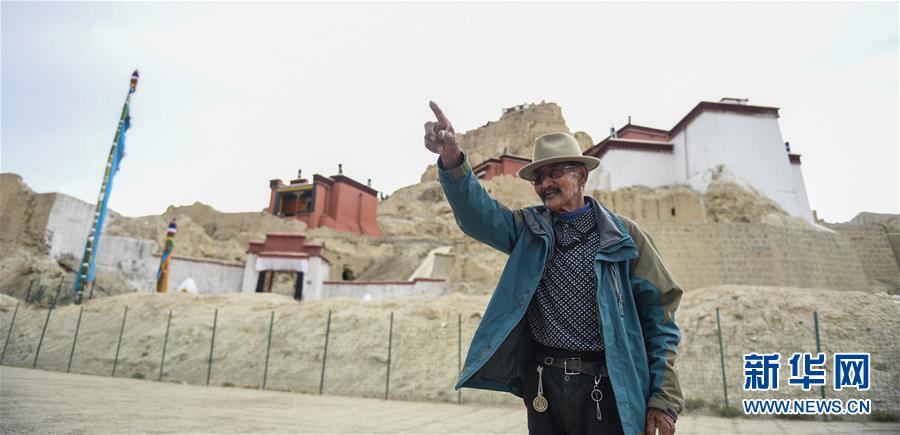 達(dá)瓦次仁在古格遺址前(7月30日攝)。新華社記者晉美多吉攝