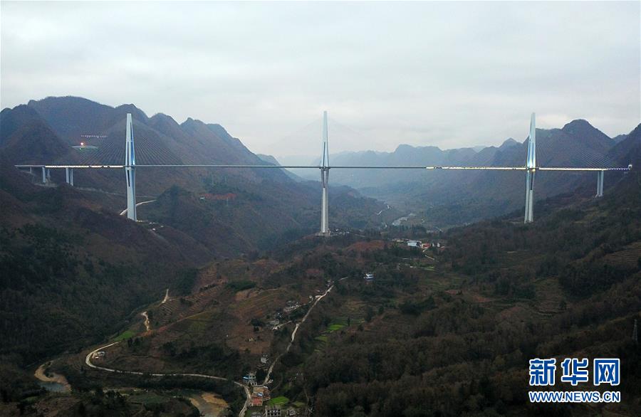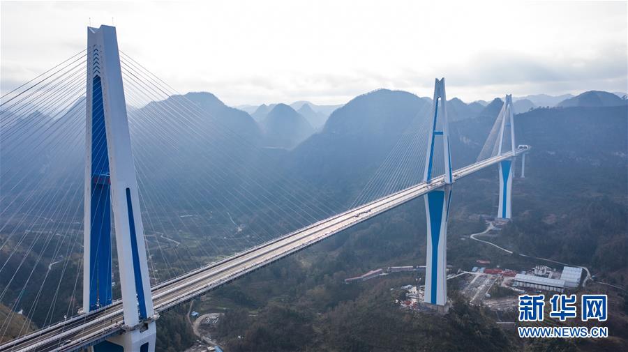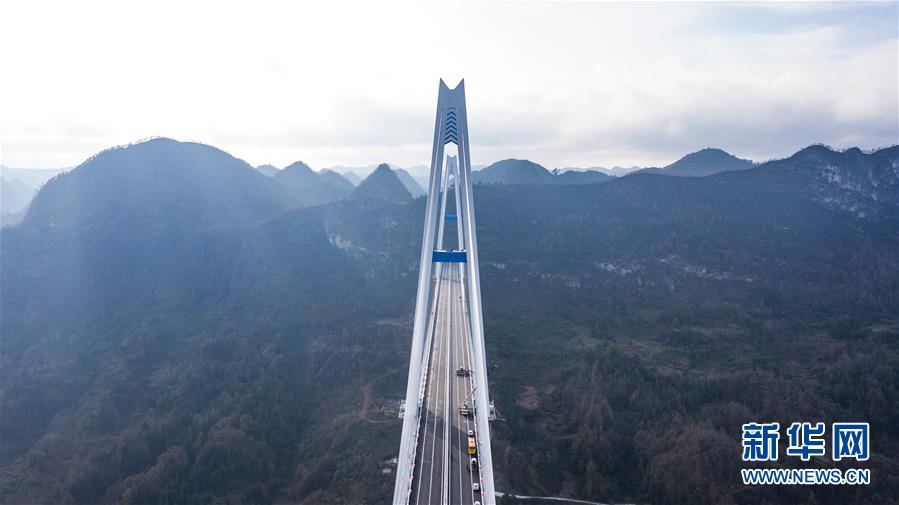 2019年1月7日無人機航拍的平塘特大橋橋塔全景,中為高332米的世界第一高混凝土橋塔。新華社記者歐東衢攝