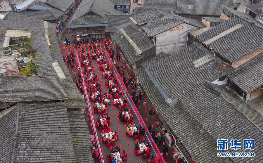 1月1日,在四川省雅安市上里古鎮(zhèn),人們?cè)谙碛媚曦i宴(無(wú)人機(jī)照片)。新華社記者 江宏景 攝