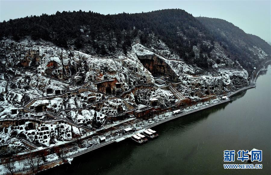 1月9日無人機拍攝的洛陽龍門石窟雪景。新華社記者李安攝