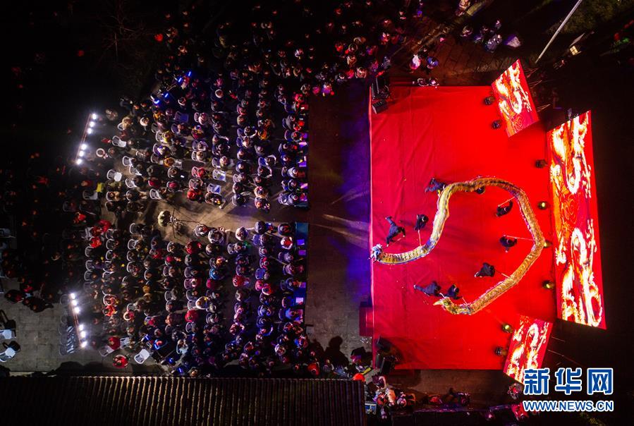 1月14日,杭州市余杭區(qū)中泰街道中橋村的文化公園內(nèi)在進(jìn)行“我們的村晚”舞龍表演,吸引了大批當(dāng)?shù)匕傩沼^看(無人機(jī)照片)。臨近春節(jié),浙江省杭州市余杭區(qū)中泰街道各村社的文化禮堂紛紛上演“我們的村晚”。老百姓自編、自導(dǎo)、自演為主的“土味”聯(lián)歡會(huì)因接地氣、親情濃而深受當(dāng)?shù)匕傩盏南矏郏蔀楫?dāng)?shù)剜l(xiāng)村百姓的新年迎春“文化大餐”。近年來,中泰街道以文化振興助推鄉(xiāng)村振興。目前,中泰街道下屬各村陸續(xù)建成文化禮堂7個(gè)、社區(qū)文化家園2個(gè),努力培育和挖掘出一批鄉(xiāng)土文化人才及原創(chuàng)作品,2019年全年開展各類鄉(xiāng)村社區(qū)惠民文體活動(dòng)累計(jì)180余場(chǎng)次。新華社記者徐昱攝