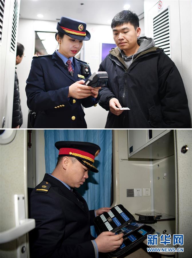 拼版照片上圖:在太原南開往西安北的D2507次列車上,列車長陳海燕(左)幫助乘客辦理補(bǔ)票業(yè)務(wù)(新華社記者詹彥1月11日攝);下圖:在陽泉北站,列車長趙耀在查看臥鋪車票(新華社記者楊晨光1月11日攝)。新華社發(fā)
