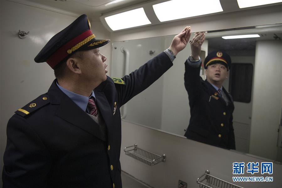 1月11日,在太原開(kāi)往青島北的K884次列車(chē)上,列車(chē)長(zhǎng)趙耀在檢查車(chē)廂衛(wèi)生情況。新華社記者 楊晨光 攝