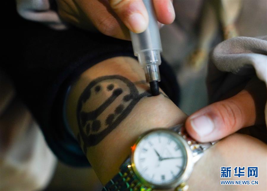 1月3日,朱梓芮在站臺上將母親手腕上稍有模糊的“手表”描繪清晰。新華社記者 胡晨歡 攝