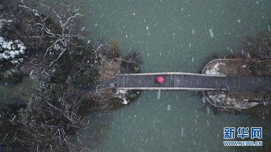 這是1月15日拍攝的合肥市包公園雪景(無人機照片)。 當日,安徽省合肥市迎來降雪天氣。雪中的合肥市包公園景色別致。 新華社記者 張端 攝