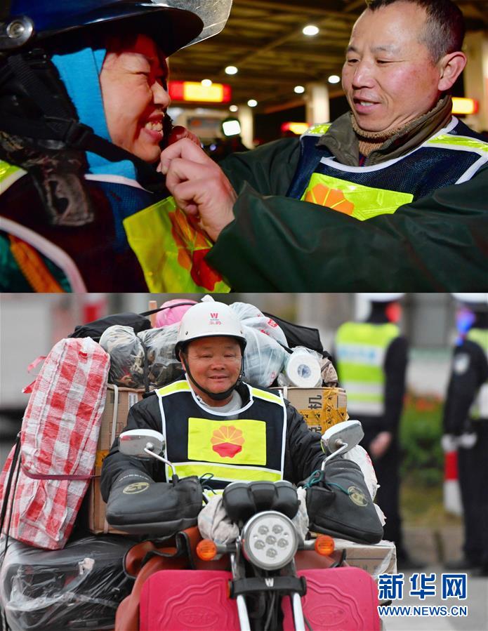 拼版照片:上圖是來自江西吉安的陳海平(右)在中國石油泉州博覽大道站給愛人郭九香整理摩托車頭盔(1月15日攝)。夫妻倆在福建泉州打工十多年,連續(xù)九年騎著摩托車返鄉(xiāng),他們表示過完年后還將再來泉州工作。