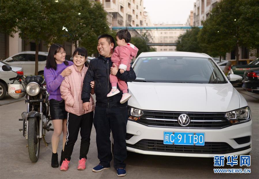 1月14日,在福建省晉江市一家服裝廠宿舍區(qū),董日旭(右二)和家人合影,一邊是他以前返鄉(xiāng)騎的摩托車,另一邊是他新買的汽車。