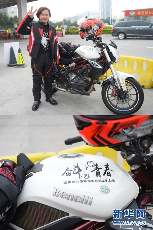 拼版照片:上圖是冉曉紅在中國石油漳州龍江路站留影,下圖是冉曉紅摩托車上的標(biāo)語(1月15日攝)。20歲的冉曉紅是重慶人,在福建廈門從事餐飲業(yè),2019年買了一輛高檔摩托車,2020年與朋友結(jié)伴騎摩托車返鄉(xiāng),路上預(yù)計需要五天時間。 新華社記者 賀燦鈴 攝