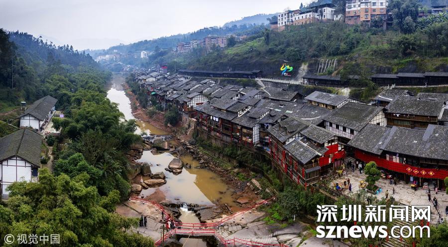 2019年1月26日,重慶中山古鎮(zhèn),880桌“千米長宴”5萬人共品年味。夜幕下的中山古鎮(zhèn),燈光璀璨,流水潺潺。