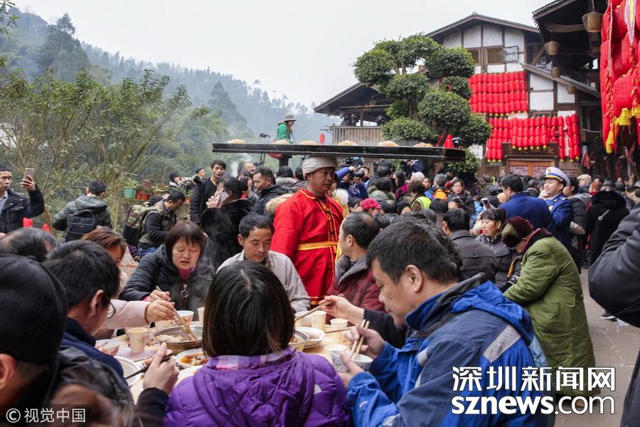 2019年1月26日,重慶中山古鎮(zhèn),880桌“千米長宴”5萬人共品年味。當(dāng)?shù)刳s來的村民。