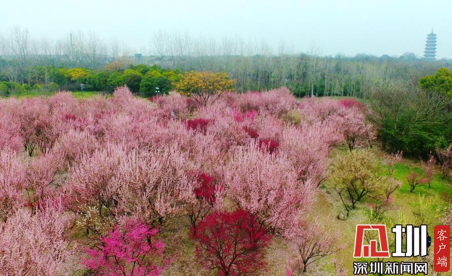 江蘇省揚(yáng)州市蜀岡西峰生態(tài)公園內(nèi)梅花競相綻放,五顏六色的梅花樹為古城大地披上七彩春裝,美不勝收。